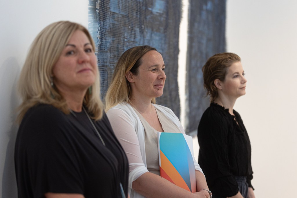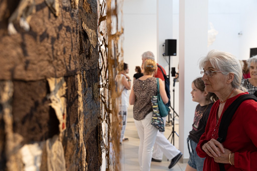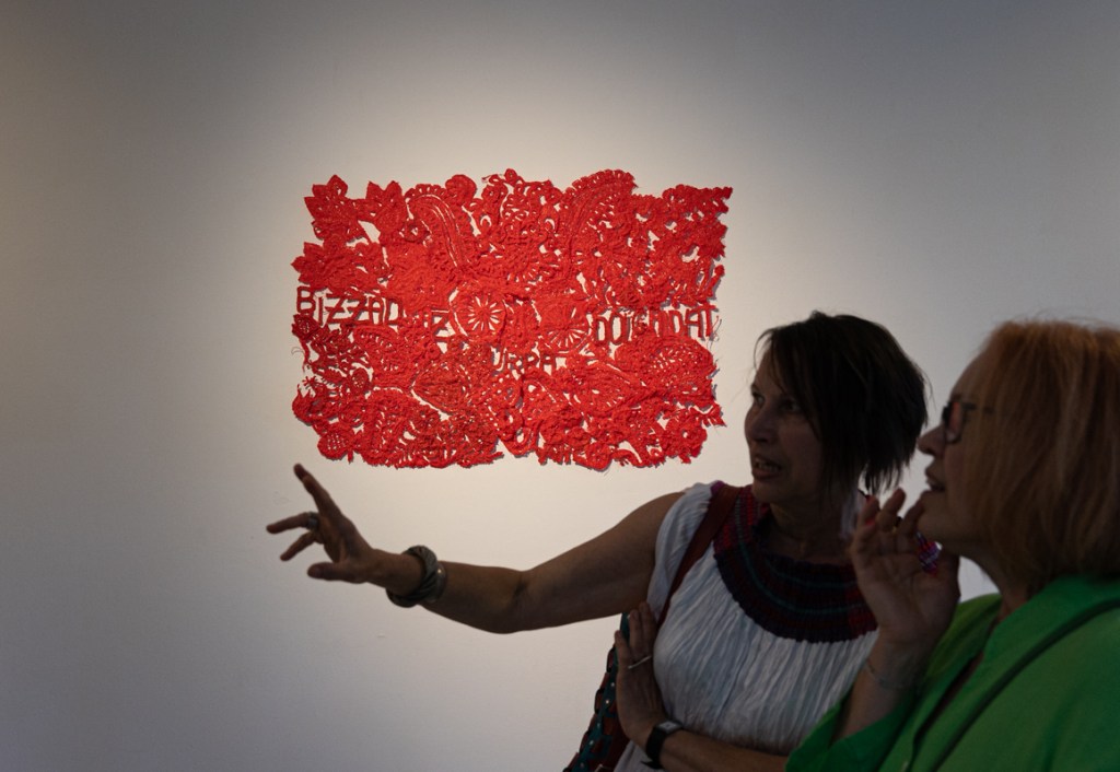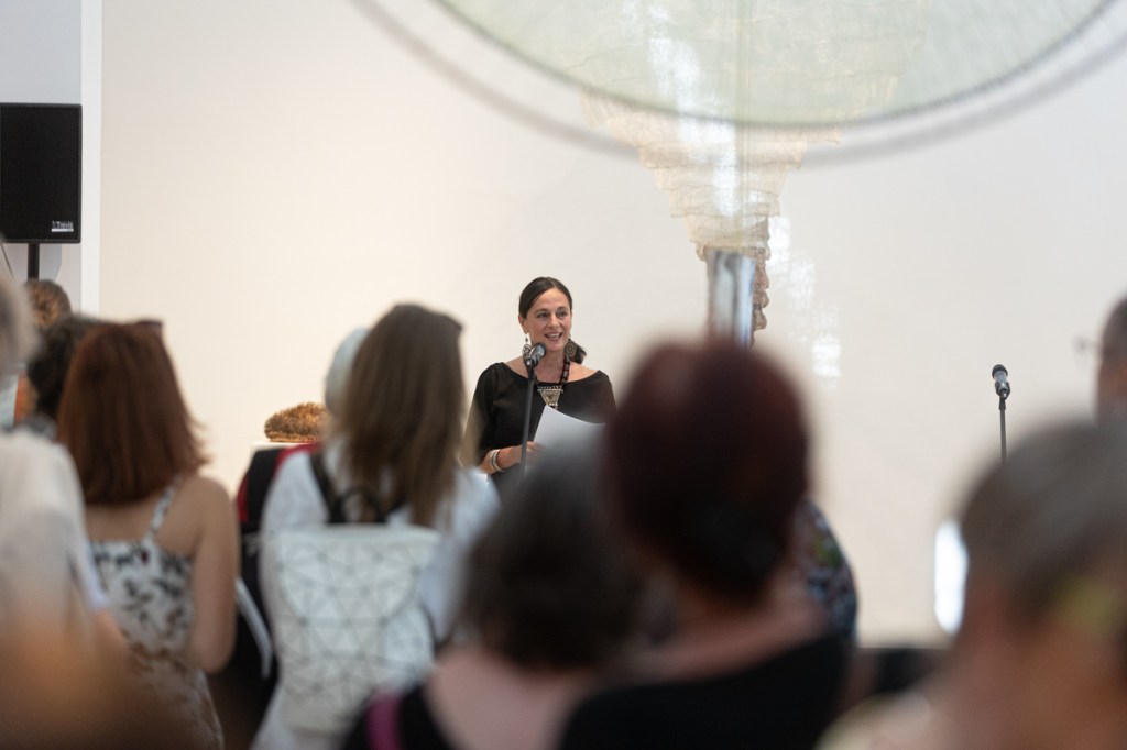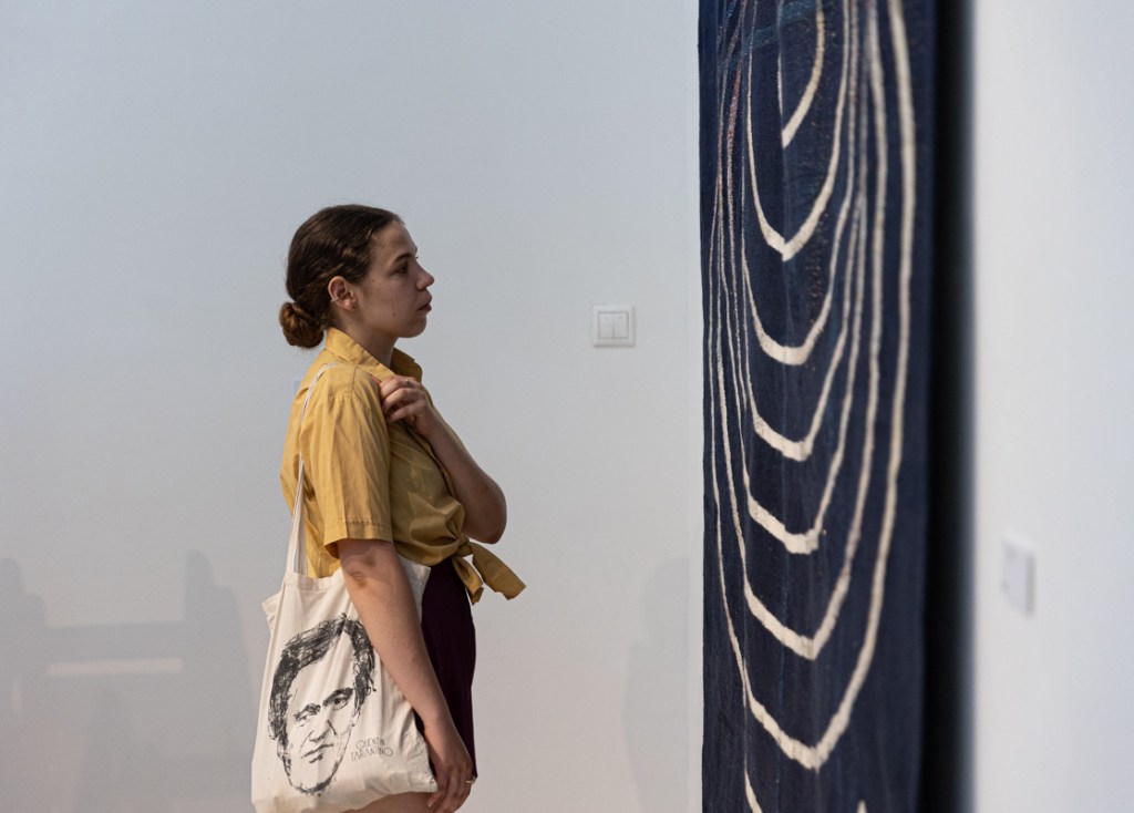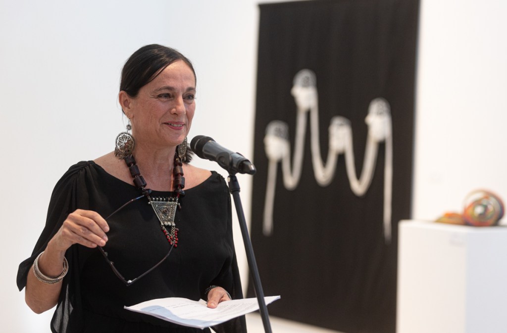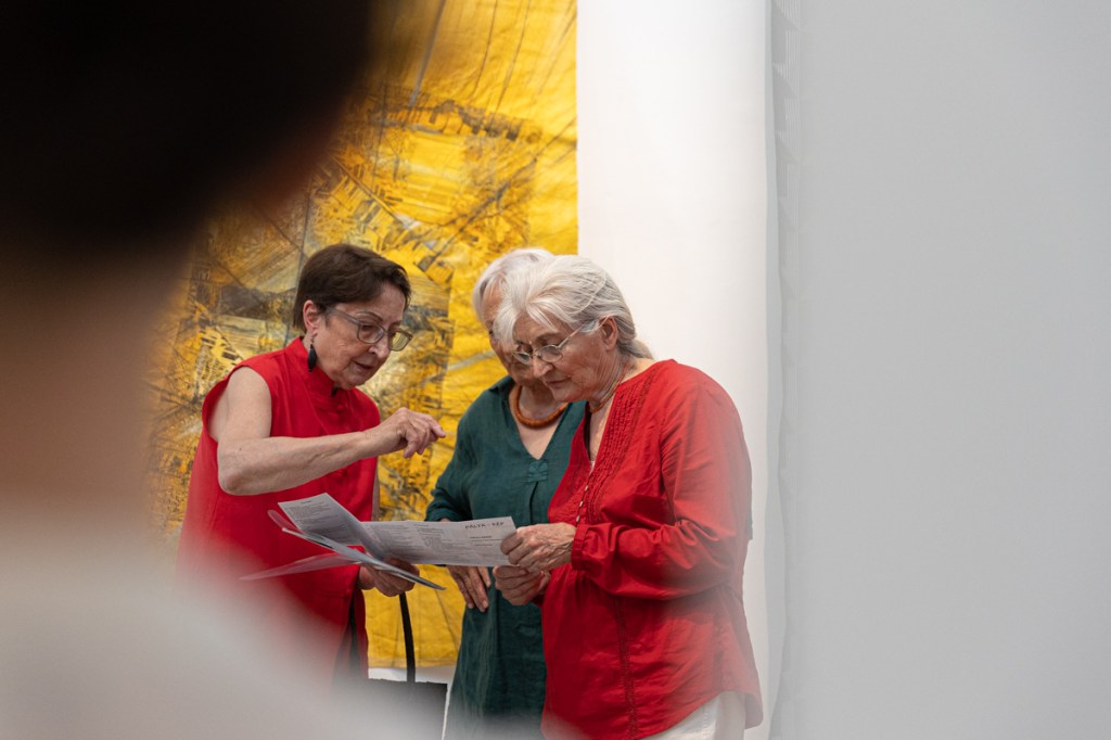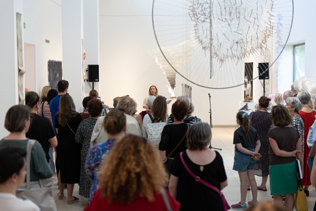 A kiállítás kurátora: Hideg Orsolya öltözéktervező- és textilművész, a Kulturális Alapítvány a Textilművészetért kuratóriumának tagja