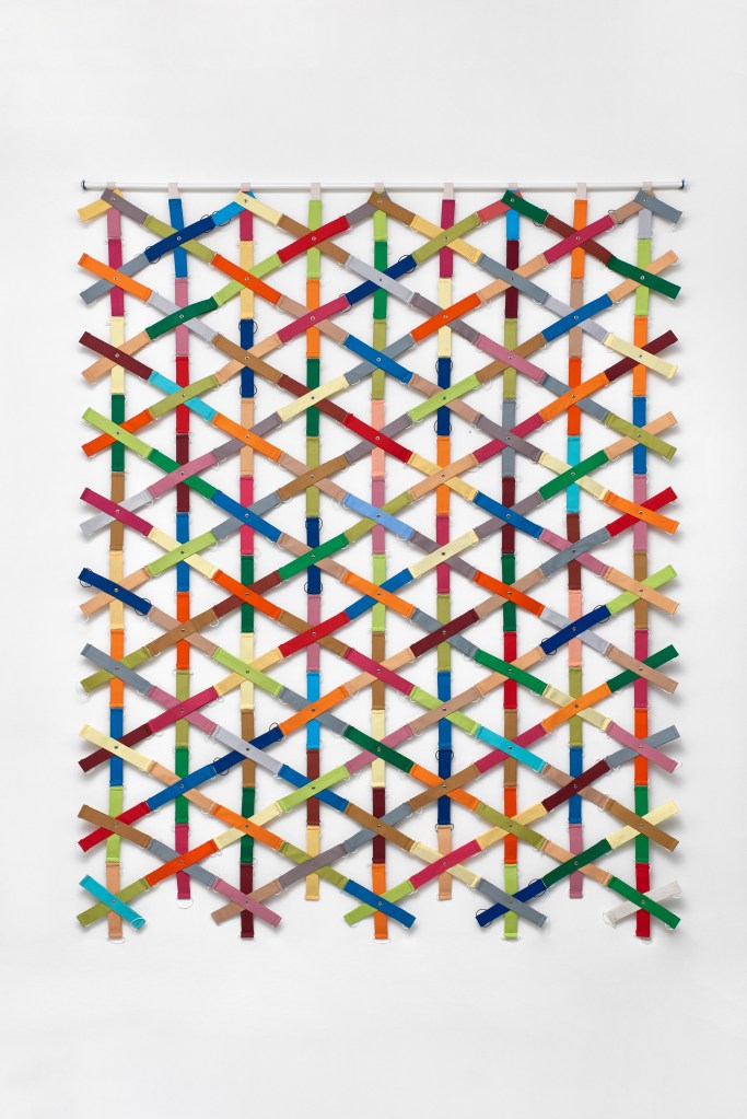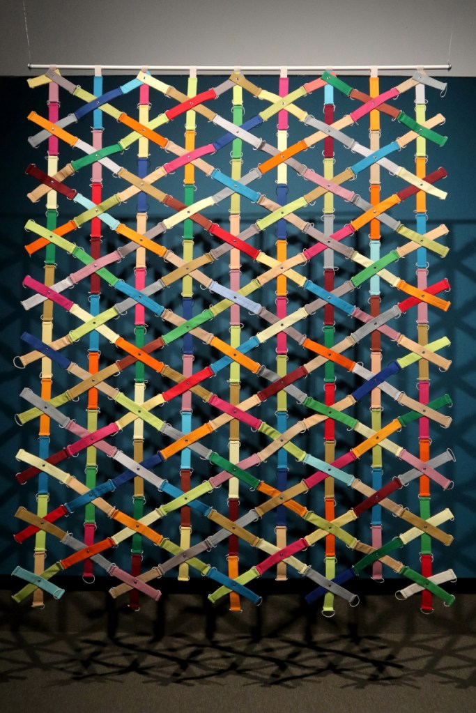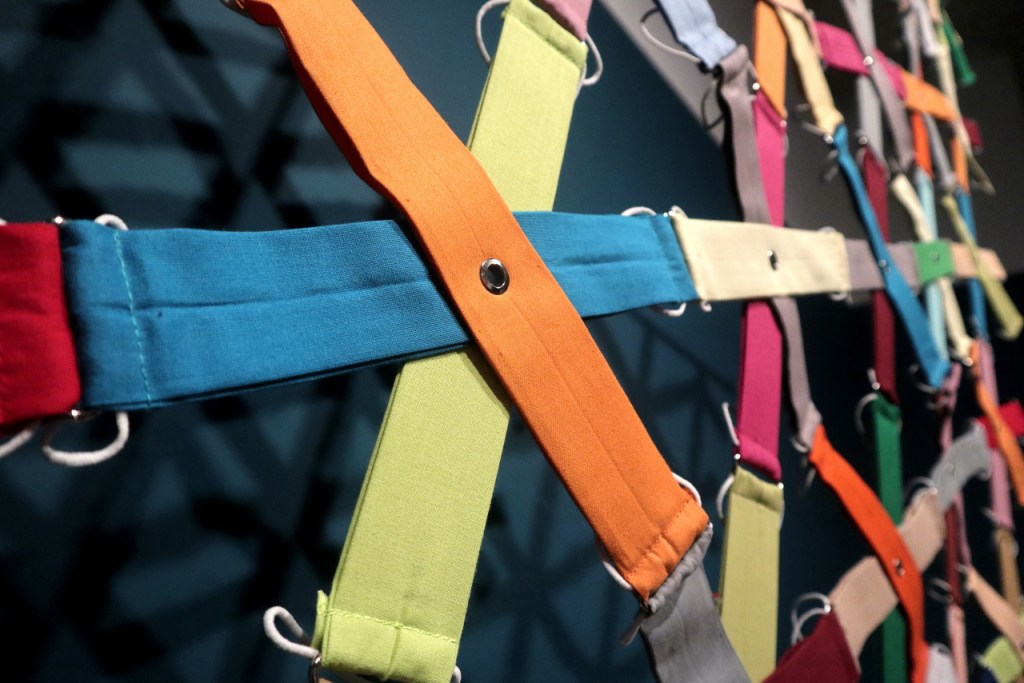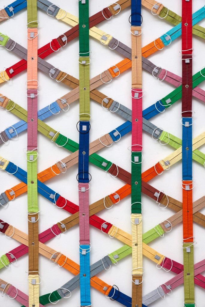 Regős Anna: Védőháló, 2023. 258 db hajtogatott, varrt pamut maszk, fémszegecsek, fém kapcsoló elemek, egyéni technika fotó: Regős Benedek
