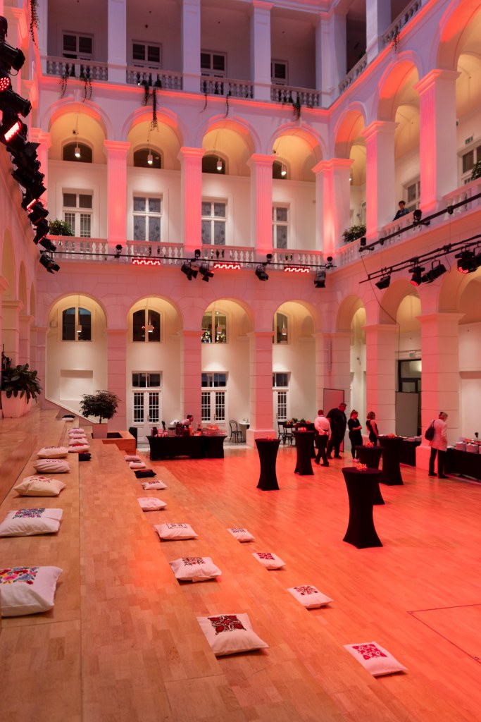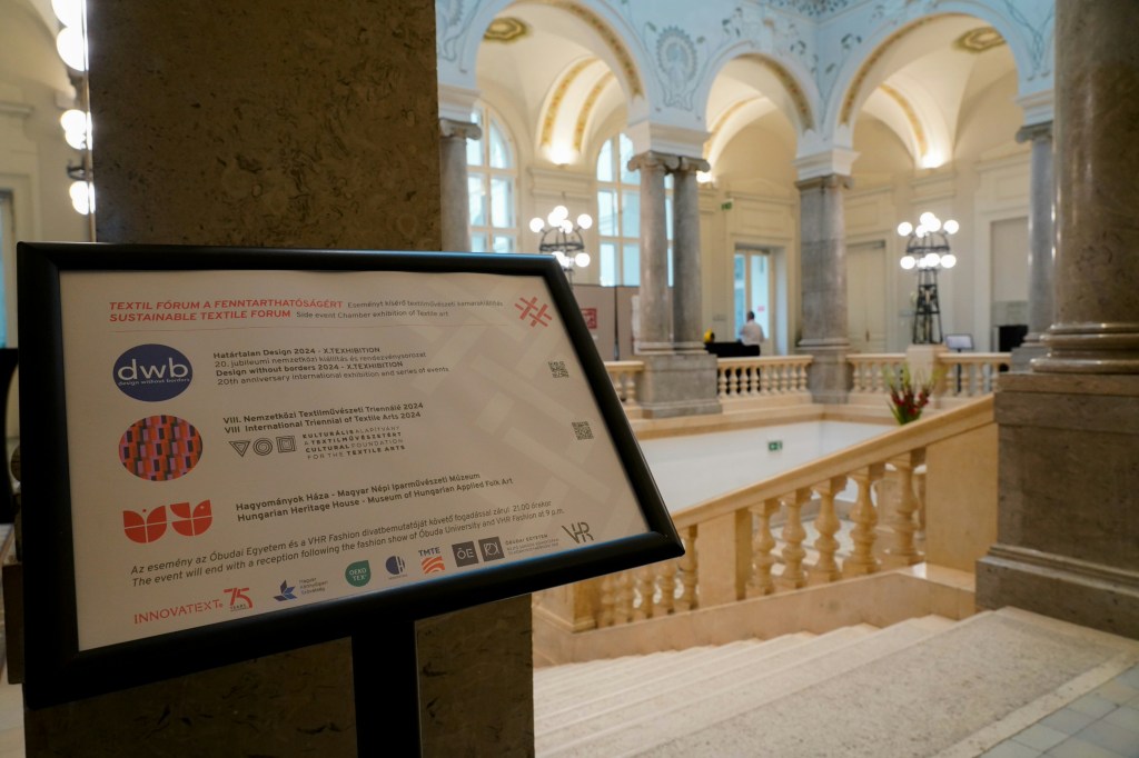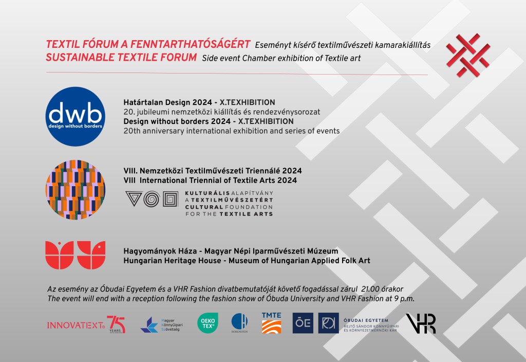 DíszteremProf.Dr. Stefan Mecheels, a Hohenstein elnök vezérigazgatójaDr. Kokasné Dr. Palicska Lívia, az Innovatext Zrt. vezérigazgatója, a MKSZ elnökeKísérő kiállításokAttalai Zita, a Kulturális Alapítvány a Textilművészetért elnökeKamilla Drubina, a Textile ETP projektmenedzsereDr. Sitányi László szakmai igazgató – Kék bolygó alapítványMartin Cieslik CMO HohensteinSzigeti Szilvia DWB előadójaDr. Kokasné Dr. Palicska Lívia és Attalai ZitaKerengőSzakmai beszélgetés, B2B találkozóa Hagyományok Háza emeleti KerengőDíszteremElőadások a díszterembenBaráth Hajnal DLA: Hagyatékaink 3.Soltész Petra: Utó(d)korSziráczky Brigita: Elvarratlan szálak, sorozat Rákhely Zsófia: Ért-ék Hat-ár Mért-ék Lonovics Zoltán: Köröm kollekcióB.Csernyánszky Katalin: Védett hagyománySöptei Eszter: Black ‘sotto-voce’ geometry series 3/3Lőrincz V.Gabi: FELTI fenntartható design szőnyegkollekcióPapp-Vid Dóra: Geoform női öltözék kollekcióAttalai Zita cipők és szegedi papucsRákhely Zsófia, Dr. Szatmári Judit AnnaA szakmai nap kamarakiállításának egyik résztvevő projektje a Szigeti Szilvia textil designer és Radnóti Tamás belsőépítész által 20 évvel ezelőtt létrehívott Design without borders / Határtalan DesignDWB Határtalan DesignDWB Határtalan Design Hagyományok Háza Magyar Népi Iparművészeti Múzeum viselettörténeti gyűjteményéből Az Óbudai Egyetem divatbemutatójaÁtrium – az ünnepélyes fogadás és a divatbemutató helyszíneDr.Csanák Edit, az Óbudai Egyetem Terméktervező Intézet igazgatója, az RKK Rejtő Sándor Könnyűipari és Környezetmérnöki Kar kutatási dékánhelyettese