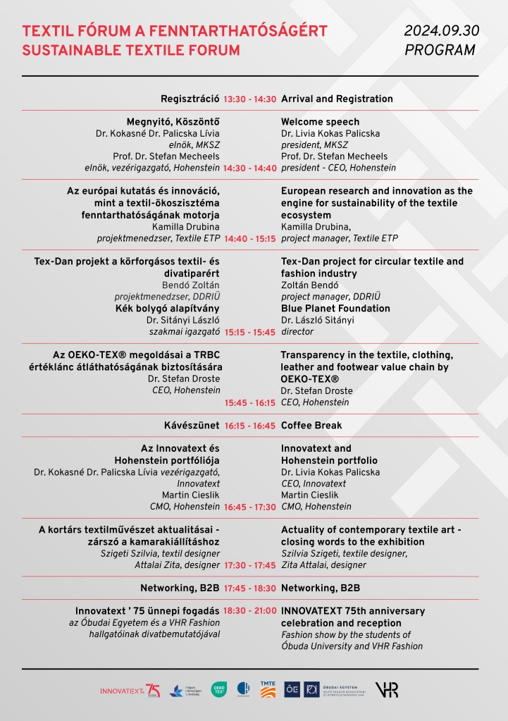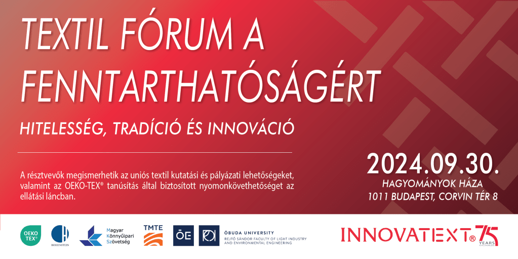 A magyar textil- és ruhaipar tudásközpontja, az INNOVATEXT Zrt. 75 éves jubileuma alkalmából nagyszabású ünnepélyes rendezvényre került sor 2024. szeptember 30-án, a Hagyományok Házában. A ‘Textil Fórum a Fenntarthatóságért’ című szakmai nap célja, hogy erősítse a szemléletváltást és inspiráló beszélgetéseket kezdeményezzen a textil és bőr ellátási láncban. A program az ágazatot érintő legfontosabb témákat ölelte fel: a fenntarthatóság és a körforgásos jövő kihívásait.
