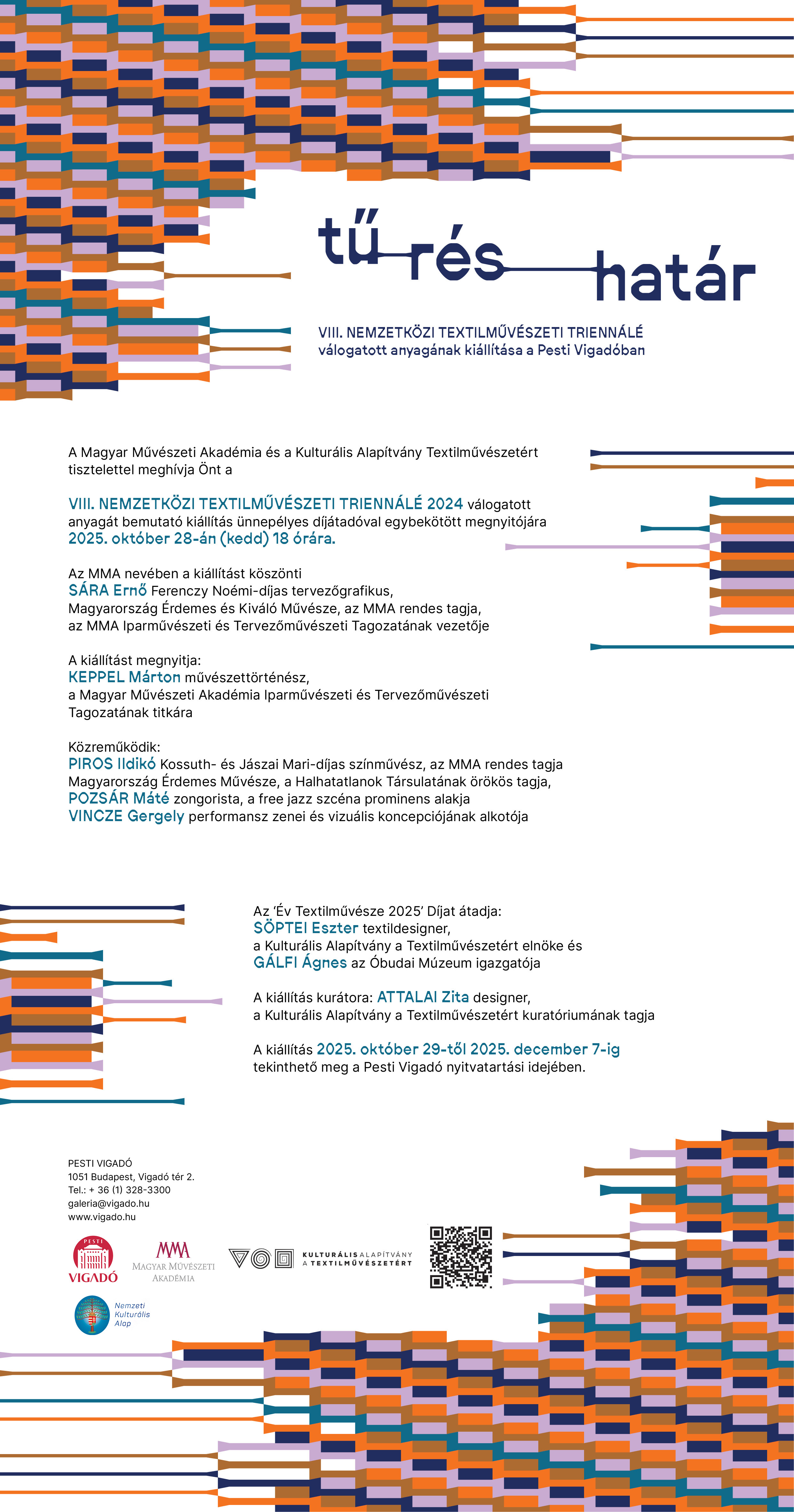 A kortárs textilművészet jelenét bemutató – VIII. Nemzetközi Textilművészeti Triennálé 2024 – magyar kiállítóinak válogatott anyagát bemutató tárlat 2025. október 29-től december 7-ig látogatható a Pesti Vigadó VI. emeleti kiállítótereiben.