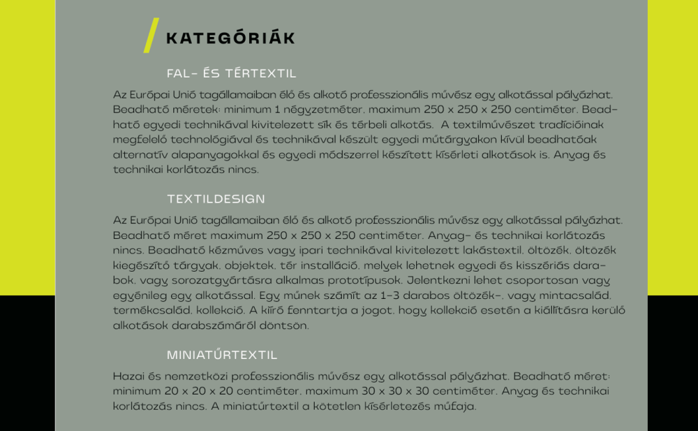 Az Európai Unió tagállamaiban élő és alkotó professzionális művész egy alkotással pályázhat. ( egy műnek számít a 1-3 darabos öltözék-, vagy mintacsalád, termékcsalád ) Beadható méret: A beadott művek 250 x 250 x 250 centimétert nem haladhatják meg. A professional artist living and working in the member states of the European Union can apply with one work. ( collection of 1-3 pieces is considered as one submission ) Size regulations: The submitted works may not exceed 250 x 250 x 250 centimeters.